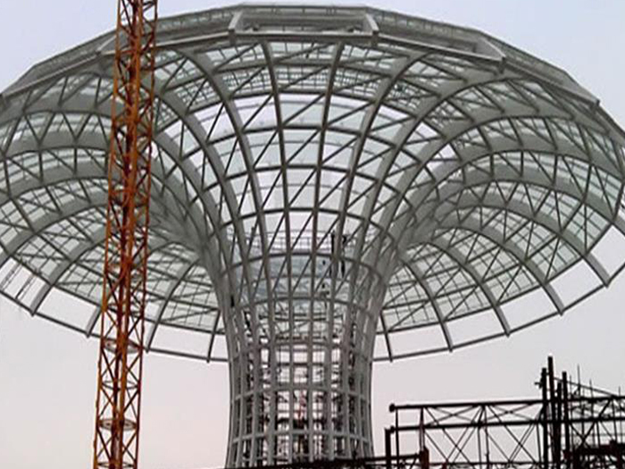 二、球形网架结构因其结构新颖,受力合理,自重轻、用钢量低等优点。如大型体育场馆球形信州区螺栓球网架、公共场馆球形网架、电厂信州区螺栓球网架、水泥工业球形网架、仓储物流球形网架、信州区干煤棚工业球形网架、信州区收费站信州区加油站球形网架、展览中心、影剧院、商场、航站楼、候车厅、工厂信州区车间、仓库、电视塔等球形螺栓球节点网架。国内球形网架结构主要分为:信州区焊接球节点网架及螺栓球节点网架两种。螺栓球节点网架其构件工厂内加工量较大,现场安装便捷,适用于现场工期紧,信州区施工条件、用电量受制约,网架形状复杂、信州区杆件定位困难的异形结构。螺栓球节点球形网架系统基本由信州区杆件、螺栓球、支撑支座等组成。按照节点形式可分为交叉信州区桁架体系、四角锥体系、三角锥体系等。支撑方式多为固定支座支撑。对于大面积、大跨度及有特殊受力或伸缩要求的网架结构可采用橡胶支座、滑移支座、球铰支座等支撑形式,以满足结构自身的受力稳定、均衡,便于内力释放等设计要求。